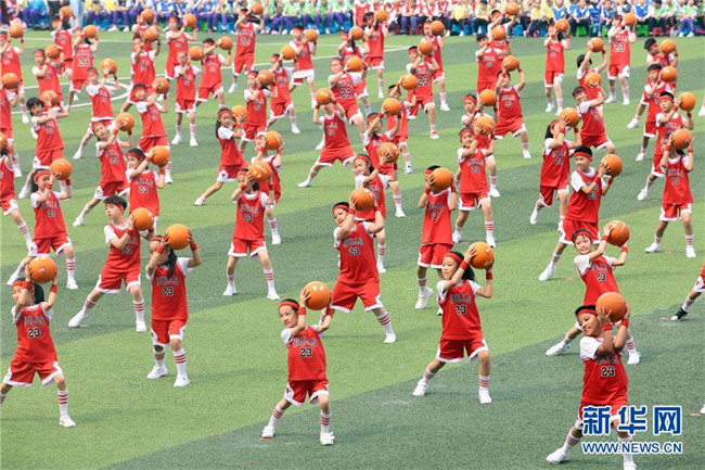 5月12日,天津市和平區(qū)岳陽道小學(xué)學(xué)生在運動會上展示集體籃球操。
