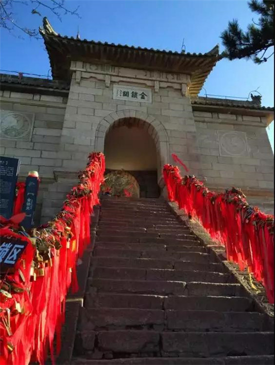 關(guān)內(nèi)關(guān)外登山路兩側(cè)的鐵索上掛滿了成千上萬枚的情侶鎖、平安鎖,人們?cè)诖肆粝旅篮玫募恼Z、囑托、祝福、祈盼。