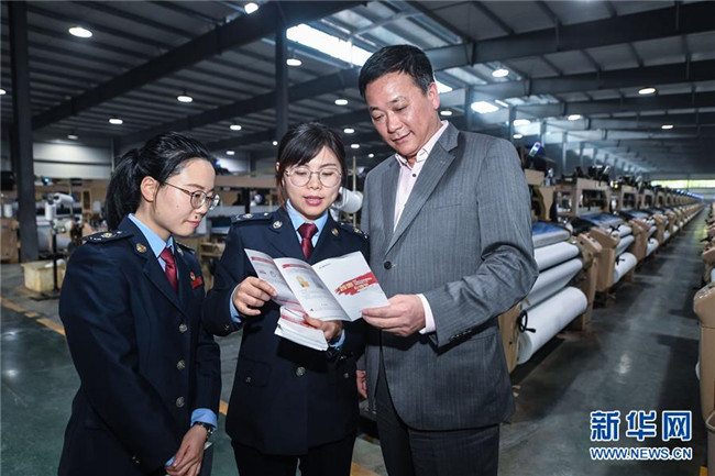 浙江省長(zhǎng)興縣稅務(wù)部門工作人員在一家公司的車間內(nèi)向企業(yè)負(fù)責(zé)人宣傳減稅降費(fèi)政策(4月16日攝)。新華社記者 徐昱 攝