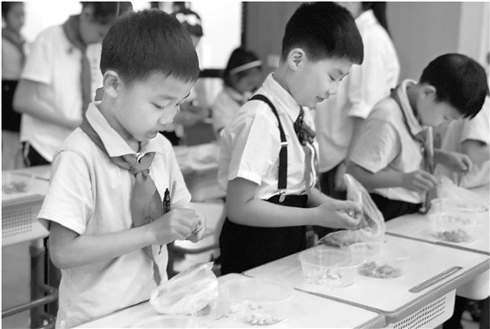 看起來,這些孩子都訓練有素。學校二(1)班班主任袁玲玲告訴記者,一個月前,蔣校長就給孩子們布置了剝毛豆的作業(yè)。