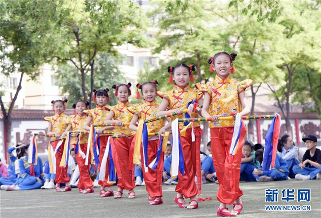當(dāng)日,內(nèi)蒙古呼和浩特市新城區(qū)滿族小學(xué)舉辦“繽紛民族情 炫彩花棍舞”主題活動(dòng),學(xué)生們身著艷麗的滿族服飾,跳起優(yōu)美飄逸的滿族花棍舞,在濃郁的民族文化氛圍中迎接即將到來的“六一”兒童節(jié)。 新華社發(fā)(王正 攝)