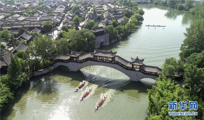 人們?cè)谏綎|省棗莊市臺(tái)兒莊古城古運(yùn)河道上劃龍舟(2019年6月7日無(wú)人機(jī)拍攝)。 新華社發(fā)(高啟民 攝)
