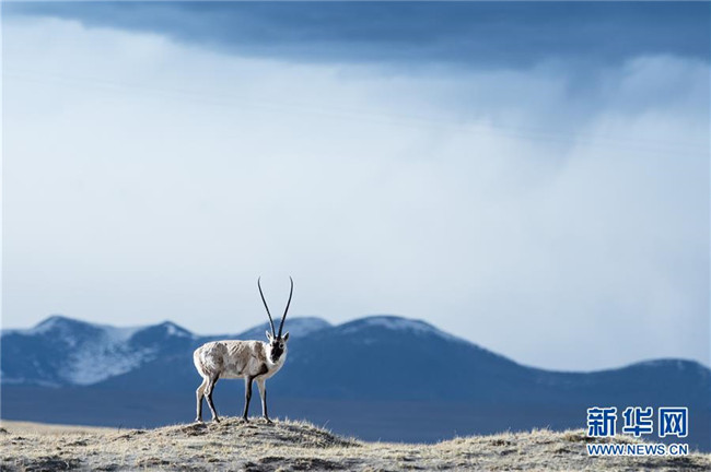 一只藏羚羊在青??煽晌骼锏貐^(qū)覓食(2015年5月19日攝)。新華社記者 吳剛 攝