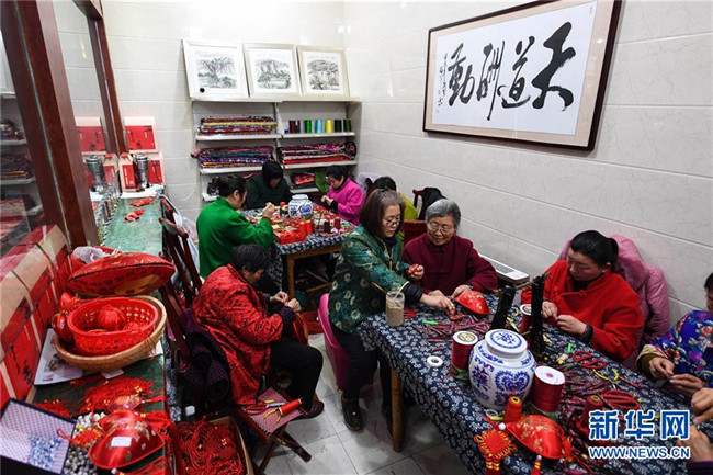 在江蘇省徐州市潘安湖國(guó)家濕地公園內(nèi)的香包工作室,王秀英老人與村民們一起制作香包(2018年1月17日攝)。新華社記者 季春鵬 攝