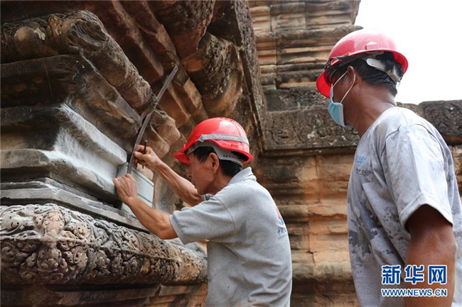 在柬埔寨暹粒,中國(guó)——柬埔寨政府吳哥古跡保護(hù)工作隊(duì)進(jìn)行茶膠寺保護(hù)修復(fù)項(xiàng)目的結(jié)項(xiàng)收尾工作(2018年7月9日攝)。新華社記者 毛鵬飛 攝