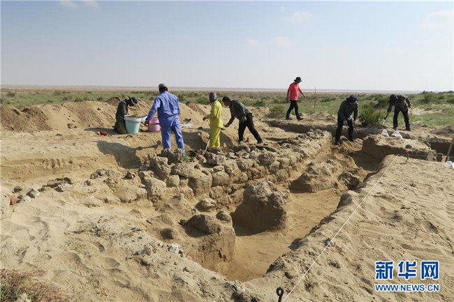 中國(guó)—沙特阿拉伯聯(lián)合考古隊(duì)隊(duì)員在沙特塞林港遺址現(xiàn)場(chǎng)工作(2019年1月12日攝)。新華社發(fā)(王霽攝)