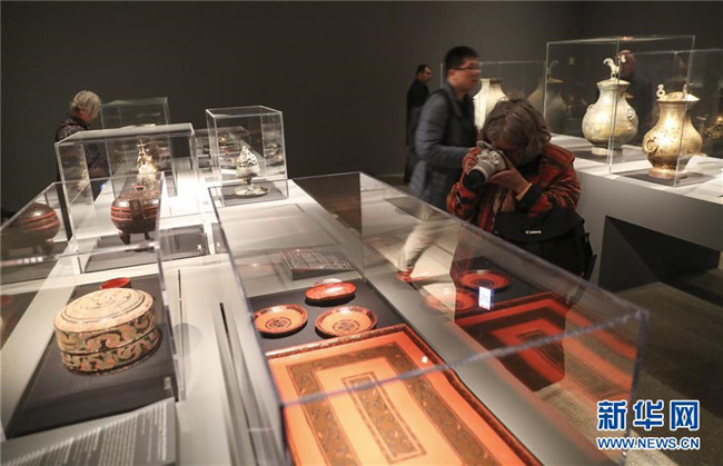 在美國(guó)紐約大都會(huì)博物館,參觀者在大型展覽“秦漢文明”媒體預(yù)展上拍攝展品(2017年3月27日攝)。