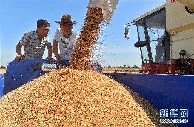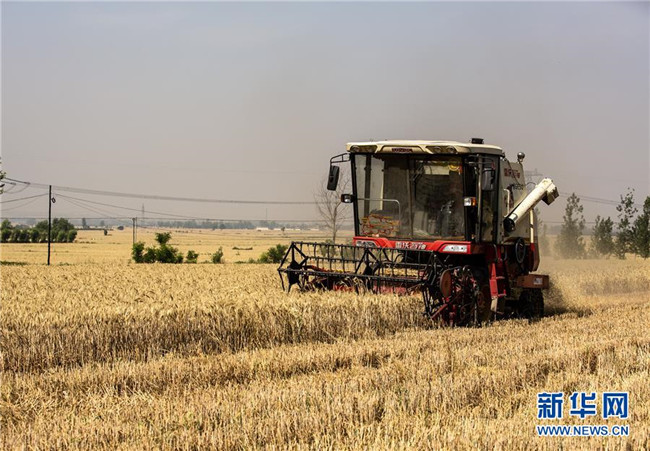 6月10日,在河北石家莊市藁城區(qū),農(nóng)民駕駛農(nóng)機(jī)收獲小麥。 新華社發(fā)(張曉峰 攝)
