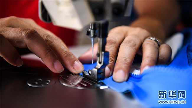 6月18日,在廣西隆林縣輕工業(yè)園區(qū)一家服裝廠,來自易地扶貧搬遷安置點的一名婦女在“扶貧車間”縫制衣服。