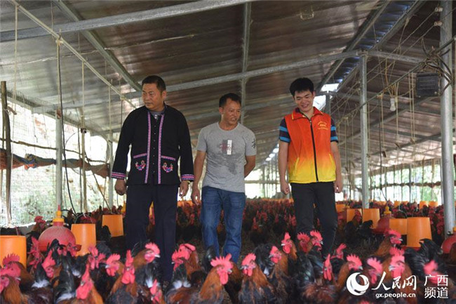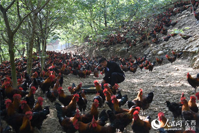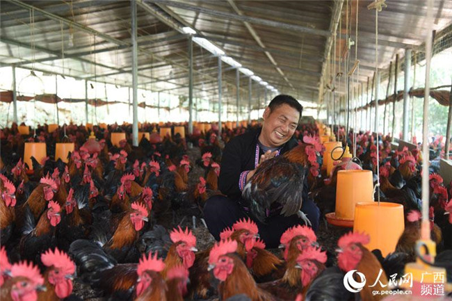 潞城瑤族鄉(xiāng)豐防村黨支部書記梁少生對養(yǎng)殖雞進行悉心管護