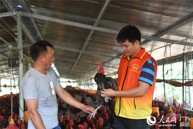 潞城瑤族鄉(xiāng)豐防村第一書記龍啟倍向養(yǎng)雞農戶了解養(yǎng)殖情況