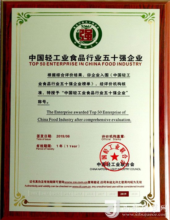 近日,由中國輕工業(yè)聯(lián)合會主辦,主題為“強化科技創(chuàng)新,服務(wù)美好生活”的“中國輕工業(yè)百強企業(yè)高峰論壇”在北京召開。會上,中國輕工業(yè)聯(lián)合會公布了2018年度中國輕工業(yè)食品行業(yè)五十強企業(yè),西鳳股份公司憑借良好的發(fā)展業(yè)績、市場口碑、行業(yè)競爭力及日益增強的品牌影響力,被中國輕工業(yè)聯(lián)合會授予“中國輕工業(yè)食品行業(yè)五十強企業(yè)”榮譽稱號,并受到表彰獎勵。