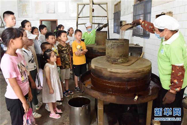 7月2日,安徽省銅陵市大通鎮(zhèn)中心學(xué)校學(xué)生在暑期社會(huì)實(shí)踐活動(dòng)中參觀大通小磨麻油制作過程。 新華社發(fā)(過仕寧 攝)