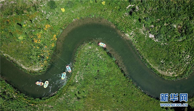 7月21日,游客在承德縣柳河十八灣花海漂游景區(qū)體驗漂流(無人機拍攝)。