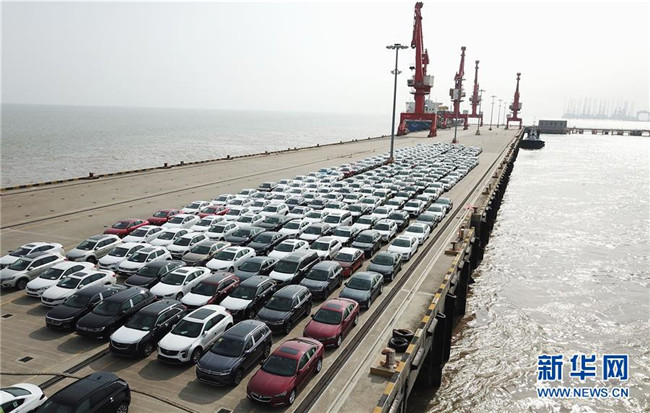 在位于上海臨港的上海南港碼頭,新出廠的汽車等待裝船轉(zhuǎn)運(yùn)(6月27日無人機(jī)拍攝)。 新華社記者 方喆 攝