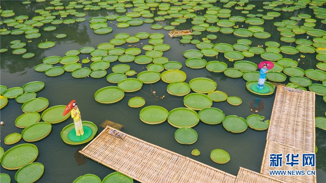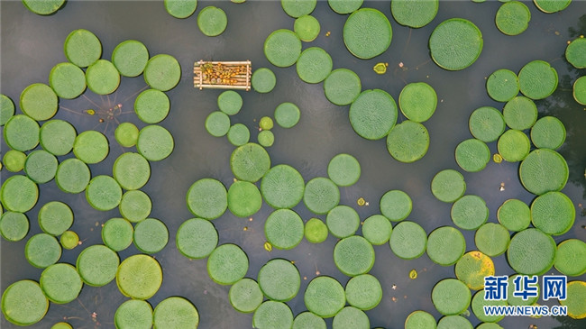 巨大的王蓮葉片如同一個(gè)個(gè)綠色的大玉盤,錯(cuò)落有致地鋪滿整個(gè)水塘。新華網(wǎng)發(fā)(張嬌嬌 攝)