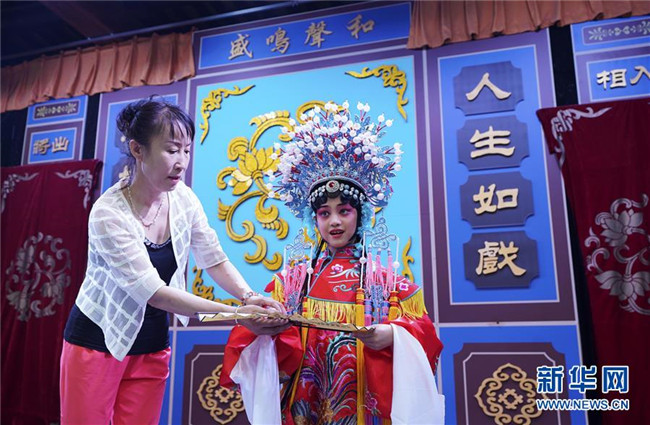 8月20日,河北省秦皇島市北戴河“裴艷玲藝術(shù)傳承基地”的老師在培訓孩子表演京劇。