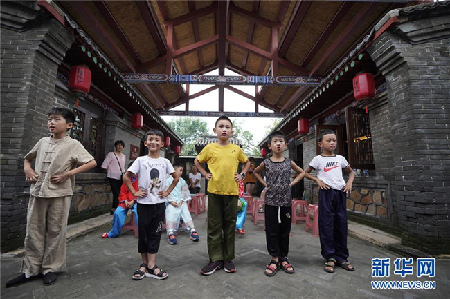 8月20日,孩子們在河北省秦皇島市北戴河“裴艷玲藝術(shù)傳承基地”學習表演京劇。
