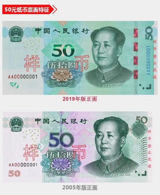 此外,2019年版第五套人民幣50元、20元、10元、1元紙幣調(diào)整正面毛澤東頭像、裝飾團花、橫號碼、背面主景和正背面面額數(shù)字的樣式,增加正面左側(cè)裝飾紋樣,取消正面右側(cè)凹印手感線和背面右下角局部圖案,票面年號改為“2019年”。