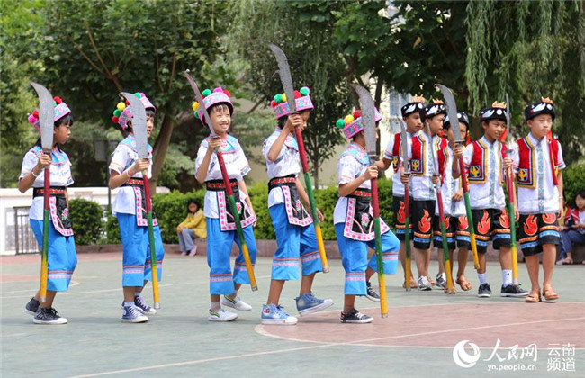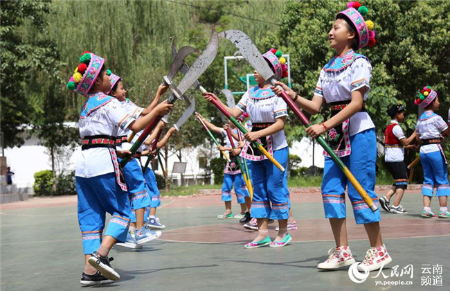 9月2日,云南省漾濞彝族自治縣雞街完小的學生在課間練習大刀舞。大刀舞是當?shù)匾妥迦罕娫陂L期的生產(chǎn)生活實踐中逐漸積累演化形成的一種彝族文化,經(jīng)過代代藝人們的不斷傳承與完善,于2013年被列為省級非物質(zhì)文化遺產(chǎn)項目保護名錄。近年來,漾濞縣不斷加大非物質(zhì)文化遺產(chǎn)保護力度,組織非遺傳承人走進校園,手把手教授孩子們學習大刀舞。(李發(fā)興)