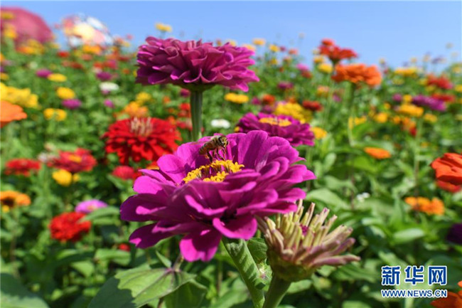 9月4日,在長春市蓮花山生態(tài)旅游度假區(qū)花田,蜜蜂在花間采蜜。