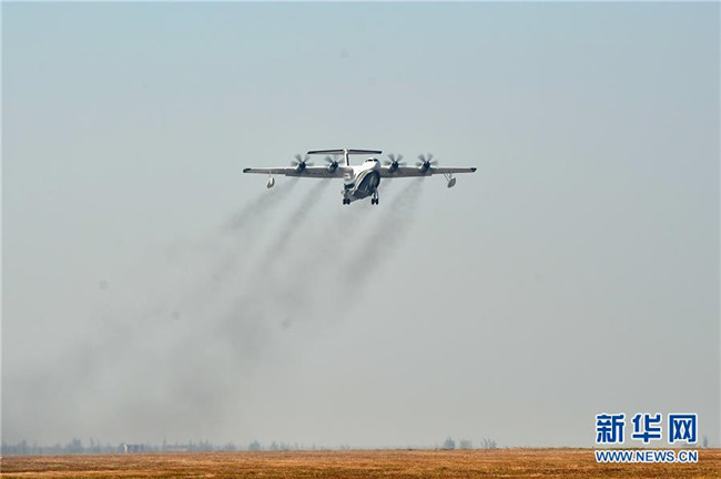 “鯤龍”AG600在珠海金灣機(jī)場起飛(2017年12月24日攝)。新華社記者 梁旭 攝