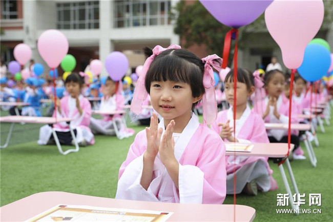 2019年9月10日,甘肅省蘭州市華僑實(shí)驗(yàn)學(xué)校為一年級(jí)新生舉辦“開(kāi)筆禮”儀式,讓孩子們體驗(yàn)傳統(tǒng)文化,迎接新的學(xué)習(xí)生涯。