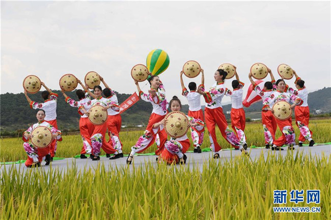 9月15日,人們在田野里表演舞蹈《吹響蘆笙慶豐收》。