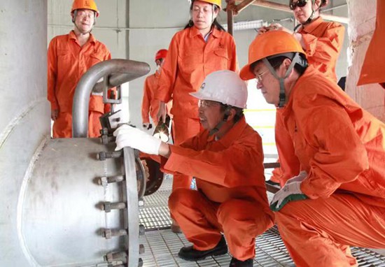 陳俊武在作業(yè)現(xiàn)場(chǎng)調(diào)試設(shè)備。中國(guó)石化洛陽(yáng)工程有限公司供圖