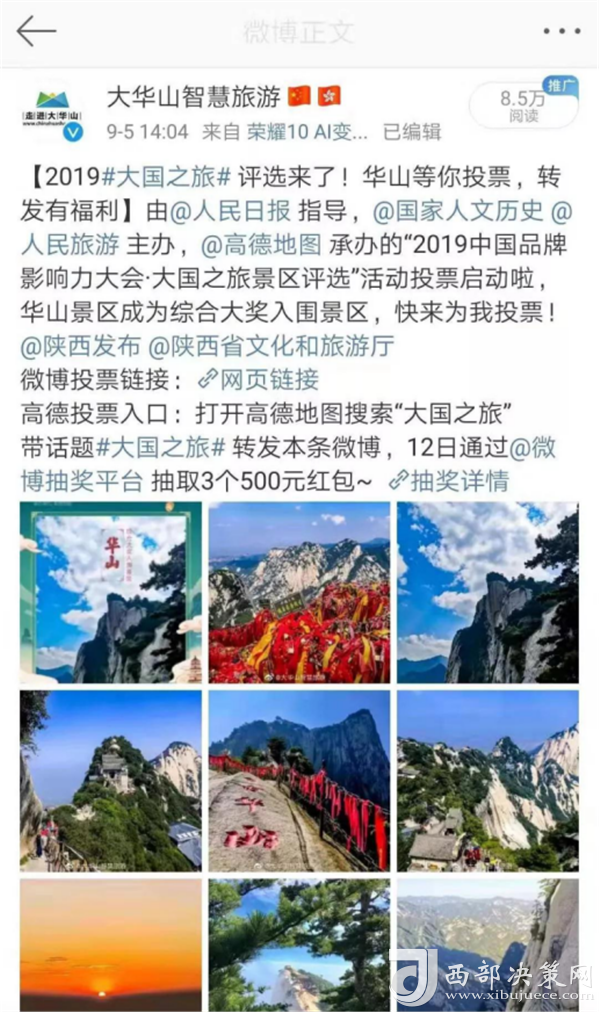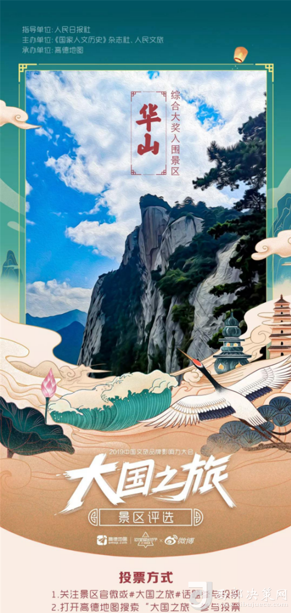 2019大國之旅景區(qū)評選活動由人民日報(bào)社指導(dǎo),《國家歷史人文》雜志社、人民旅游主辦,高德地圖承辦,于9月2日正式啟動。此次活動采取大眾投票+高德地圖旅游大數(shù)據(jù)+專家及媒體評審相結(jié)合的形式,得出最終獲獎名單。游客通過新浪微博關(guān)注景區(qū)官博“ 大華山智慧旅游”為華山景區(qū)投票,智旅公司協(xié)助高德地圖完善了華山景區(qū)地圖板塊的校準(zhǔn)和更新,此次活動的開展,華山景區(qū)的品牌影響力和知名度也再次得到提升。