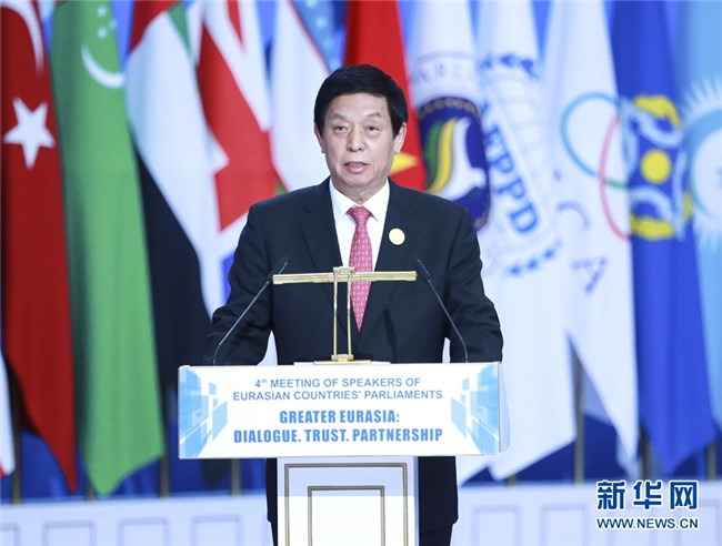栗戰(zhàn)書指出,歐亞大陸是世界上面積最大、人口最多、發(fā)展最迅速、前景最廣闊的大陸,歐亞各國利益與共、安危與共。歐亞各國需要攜手努力,加強(qiáng)對話、信任、合作,促進(jìn)和平、穩(wěn)定、繁榮。栗戰(zhàn)書提出四點建議:一是加強(qiáng)溝通協(xié)商,尊重各國自主選擇的發(fā)展道路,弘揚(yáng)伙伴精神,求同存異,擴(kuò)大共識,增進(jìn)政治互信;二是拓展經(jīng)貿(mào)合作,促進(jìn)貿(mào)易和投資自由化便利化,推動世界經(jīng)濟(jì)開放、包容、普惠、平衡、共贏發(fā)展;三是密切人文交流,推動文化、教育、旅游、體育、媒體、青年等領(lǐng)域合作,促進(jìn)民心相通;四是深化立法機(jī)構(gòu)交往,落實好國家領(lǐng)導(dǎo)人達(dá)成的重要共識,助力國家關(guān)系發(fā)展,為深化歐亞合作增添亮點、提供保障。