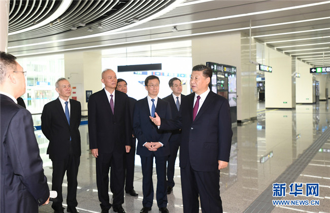 9月25日上午,北京大興國際機(jī)場(chǎng)投運(yùn)儀式在北京舉行。中共中央總書記、國家主席、中央軍委主席習(xí)近平出席儀式,宣布機(jī)場(chǎng)正式投運(yùn)并巡覽航站樓。這是習(xí)近平在綜合交通中心聽取機(jī)場(chǎng)綜合交通體系建設(shè)情況介紹。 新華社記者 謝環(huán)馳 攝