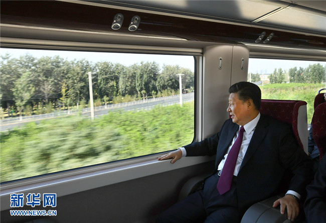 9月25日上午,北京大興國際機(jī)場(chǎng)投運(yùn)儀式在北京舉行。中共中央總書記、國家主席、中央軍委主席習(xí)近平出席儀式,宣布機(jī)場(chǎng)正式投運(yùn)并巡覽航站樓。這是習(xí)近平乘坐軌道列車前往北京大興國際機(jī)場(chǎng)。 新華社記者 謝環(huán)馳 攝