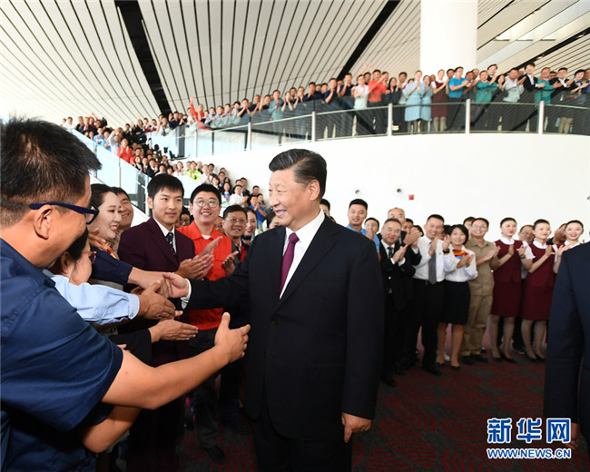 9月25日上午,北京大興國際機(jī)場(chǎng)投運(yùn)儀式在北京舉行。中共中央總書記、國家主席、中央軍委主席習(xí)近平出席儀式,宣布機(jī)場(chǎng)正式投運(yùn)并巡覽航站樓。這是習(xí)近平看望參與機(jī)場(chǎng)建設(shè)和運(yùn)營的工作人員代表,同他們親切交談。 新華社記者 王曄 攝