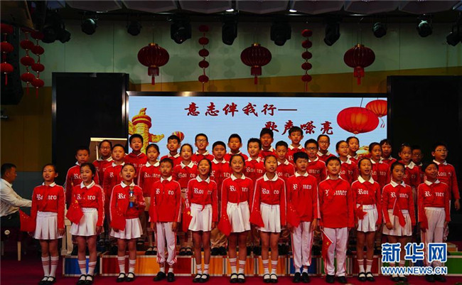 9月26日,北京市建華實驗學(xué)校的小學(xué)生在活動中合唱紅色歌曲。