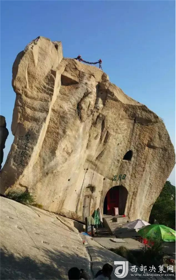 華山以石著名,每一處奇石都有一個美麗而動人的傳說。過了擦耳崖,看到的這兩塊石頭叫“日月巖”,左邊的代表“日”,右邊的代表“月”,上面這四個字是“云天弧光”,有時在夜晚,這里會出現(xiàn)一道非常耀眼的光。相傳武則天當年上華山走這里,看到這兩塊形似日月的石頭,就別出心栽地給自個兒的字號創(chuàng)造了一個“瞾”字,因為這兩塊奇石上頂青天,下臨空谷,唯我獨尊,是光明與權(quán)威的象征。
