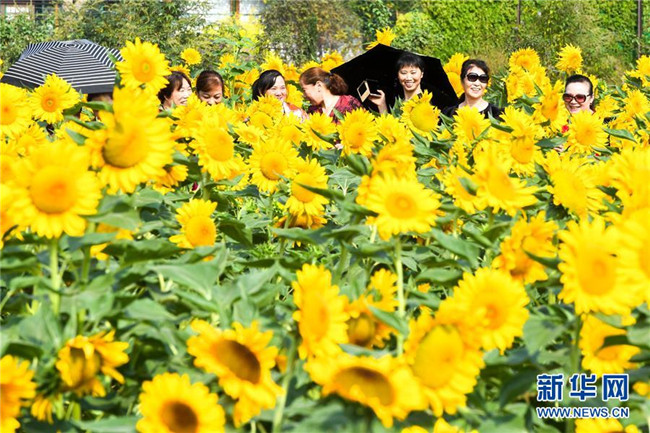 近日,位于長沙市的湖南省森林植物園中的向日葵在秋陽下競相綻放,黃花綠葉交相輝映,吸引眾多市民、游客前來觀賞。