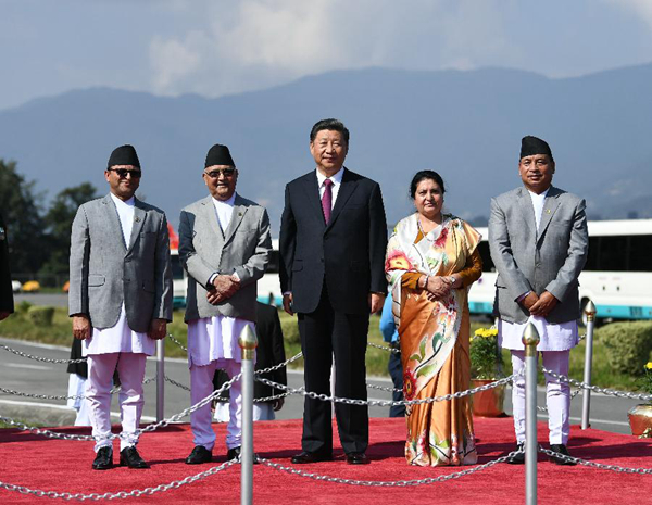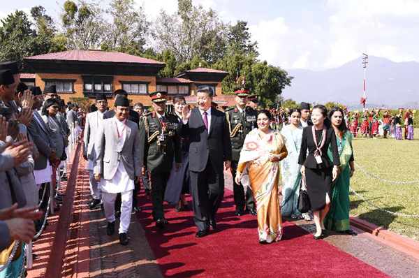 10月12日,國(guó)家主席習(xí)近平乘專機(jī)抵達(dá)加德滿都,開(kāi)始對(duì)尼泊爾進(jìn)行國(guó)事訪問(wèn)。尼泊爾總統(tǒng)班達(dá)里在機(jī)場(chǎng)為習(xí)近平舉行具有濃郁尼泊爾民族特色的歡迎儀式。新華社記者高潔攝