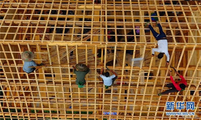在黔桂烏英苗寨,群眾在幫助貧困戶吳仕足修建新木樓(9月3日無人機(jī)拍攝)。
