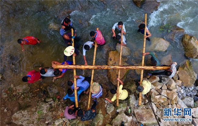 群眾在黔桂烏英苗寨蘆笙坪施工現(xiàn)場勞動(dòng)(7月27日無人機(jī)拍攝)。