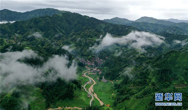 這是位于大山深處的黔桂烏英苗寨(7月6日無人機(jī)拍攝)。