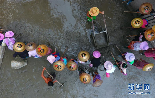 在黔桂烏英苗寨,群眾在修河堤(7月3日無人機(jī)拍攝)。