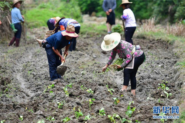 在黔桂烏英苗寨,村民在合作社紅薯種植基地栽種紅薯苗(5月24日攝)。