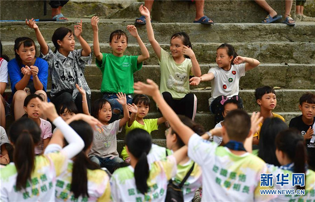 黔桂烏英苗寨的孩子們在澳門志愿者的指導(dǎo)下練習(xí)表演(8月10日攝)。
