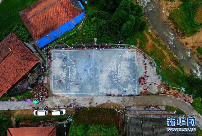 黔桂烏英苗寨的群眾在打籃球(7月19日無人機(jī)拍攝)。