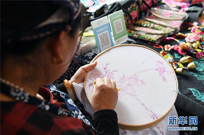10月16日,團結(jié)村的一名“巧媳婦”在刺繡。  新華社記者 楊宗友 攝