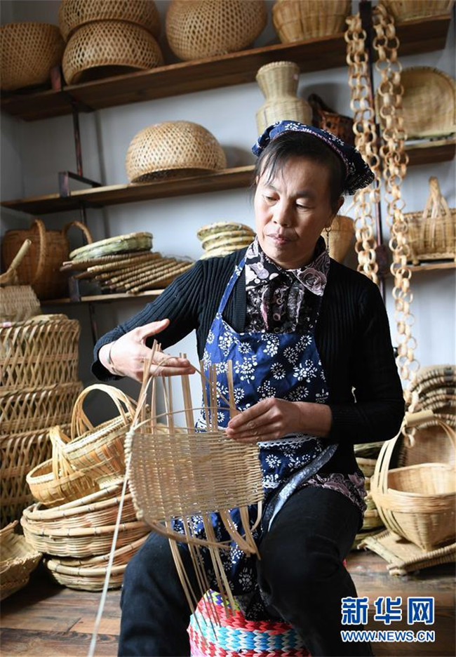 10月16日,團結(jié)村的“巧媳婦”袁悅花在編織竹制家庭用具。  新華社記者 楊宗友 攝