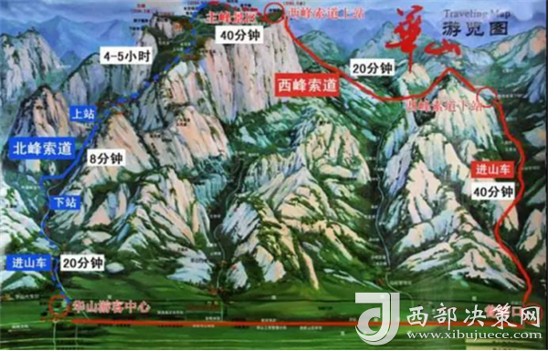 自古華山一條路(徒步上山)—北峰(華山論劍)—東峰(看日出,鷂子翻身)—南峰(煉丹爐、八卦池、長空棧道)—西峰(翠云宮、蓮花洞、巨靈足、斧劈石、舍身崖)—北峰(真武殿、玉女窗、老君掛犁處、鐵牛臺(tái)、等)—華山自古一條路或智取華山路(徒步下山)