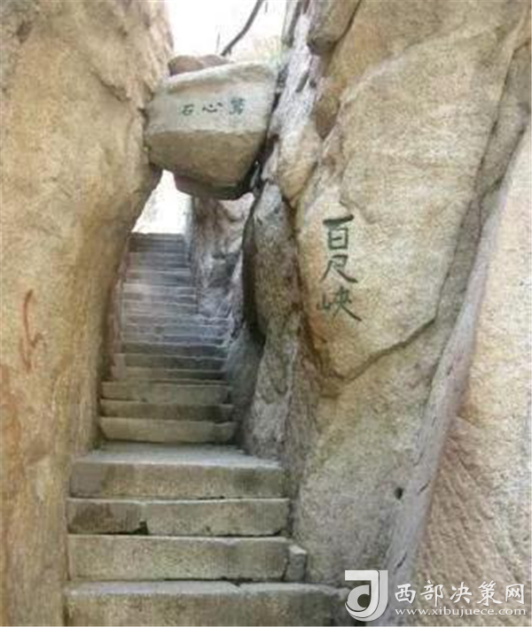 出千尺幢不遠(yuǎn)是百尺峽,這里是登山第二道險(xiǎn)關(guān)。雖沒有千尺幢那么長,僅46米,石階91級,但仍是華山天險(xiǎn)之一。這里勢危坡陡,石壁峭立,通道狹窄,且有懸石,搖搖欲墜。游人至此都心驚膽顫。明顧端木有詩狀其險(xiǎn)曰:"幢去峽復(fù)來,天險(xiǎn)不可瞬。雖云百尺峽,一尺一千仞。"千尺幢、百尺峽的臺(tái)階都是從明末清初開始鑿的,民國時(shí)幾經(jīng)加固,解放后又多次修整,一九八五年又鑿復(fù)道,游人上下各行其道。