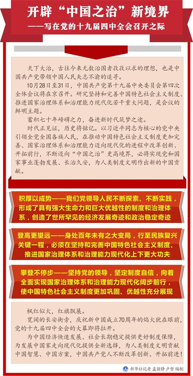 10月28日至31日,中國共產(chǎn)黨第十九屆中央委員會第四次全體會議將在京召開。研究堅持和完善中國特色社會主義制度、推進國家治理體系和治理能力現(xiàn)代化若干重大問題,是會議的鮮明主題。